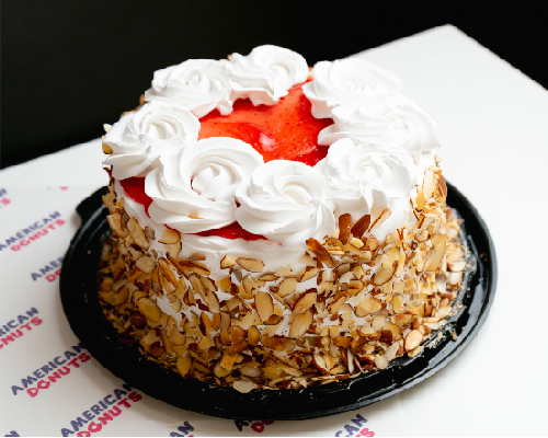 Pastel gourmet, torta de vainilla, con relleno de crema, cubierto con crema y almendras. Diseño del pastel puede variar.