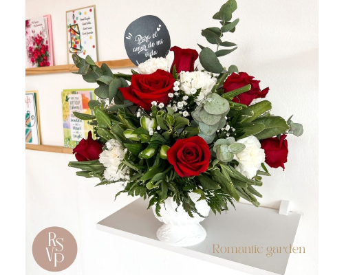 Estilo de 12 unidades de rosas con relleno de claveles, eucalipto y nubes. Jarrón de plástico.