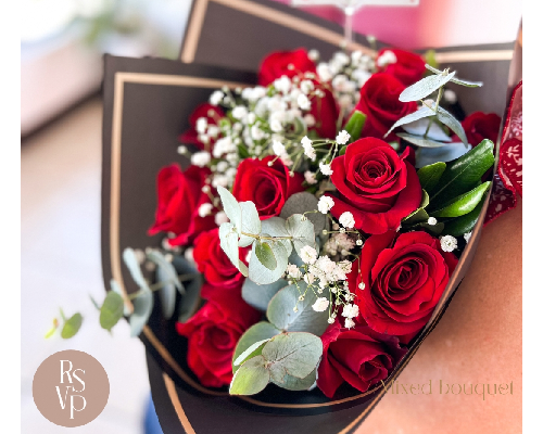Hermoso ramo de 12 unidades de rosas con relleno de eucalipto y nubes.