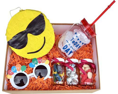 Caja con un vaso cumpleañero, una mini piñata, un lentes cumpleñeros y tres jarras de caramelos variados (chocolates, caramelos y gomitas).