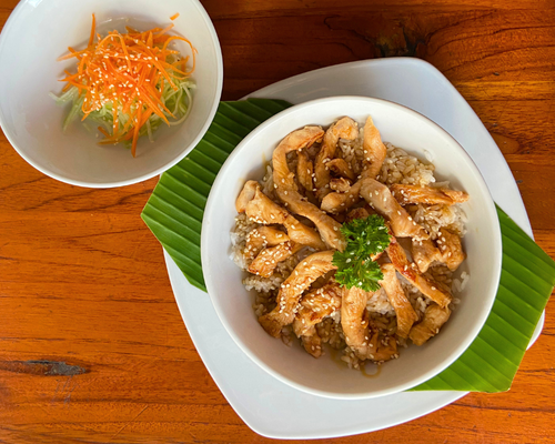 Descripción: Arroz blanco al vapor y tiras de pechuga de pollo marinadas y asadas servidas con salsa teriyaki y ajonjoli, acompañadas con una guarnición de pepino y zanahoria con vinagre sushi.