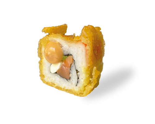 Descripción: Queso crema, salmón fresco y aguacate por dentro; cangrejo capeado; servido con salsa chipotle.