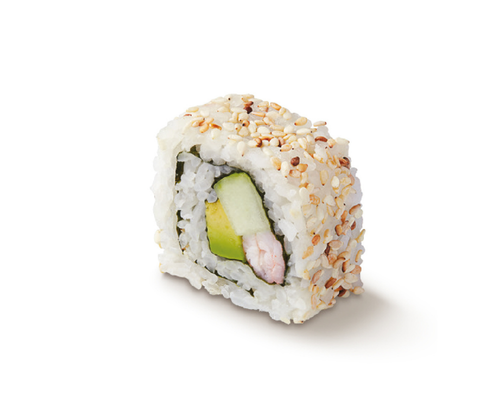 Descripción: Aguacate, pepino y camarón por dentro; ajonjolí por fuera.