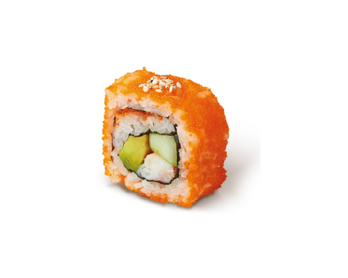 Descripcion: Aguacate, pepino y camarón por dentro; masago y ajonjolí por fuera.