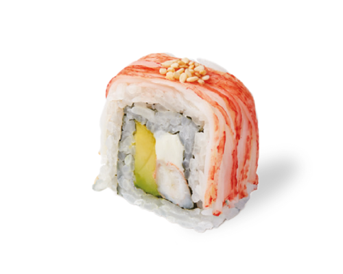 Descripción: Camarón, aguacate y queso crema por dentro; cangrejo y ajonjolí por fuera.