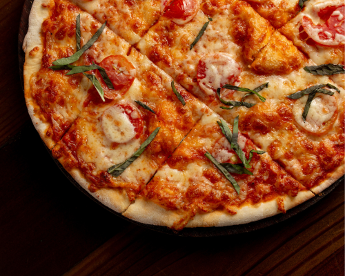 Salsa de tomate, mozzarella, albahaca, aceite y tomate fresco.