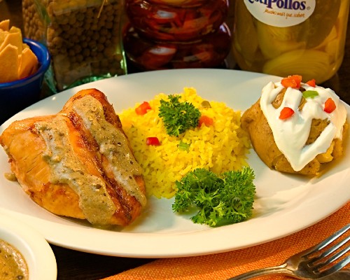 Pechuga deshuesada con salsa a la pimienta, arroz amarillo y papa entera con crema o mantequilla.