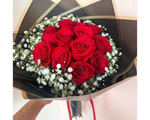 Hermoso bouquet de 12 unidades rosas rojas con toques de nubecillas blancas.