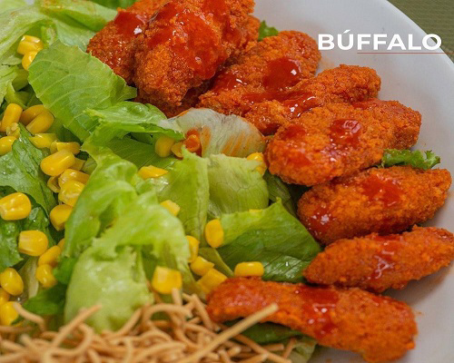 Deditos de pollo empanizado y bañados con salsa chile búfalo, mezcla de lechugas frescas, maíz dulce, pico de gallo, palitos chinos, tomate en dados y aderezo blue cheese.