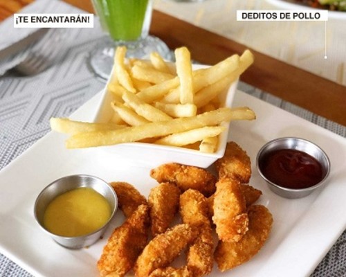 Pollo en tiritas empanizados en nuestra mezcla especial y servido con papas fritas y salsa miel mostaza hecha en casa!