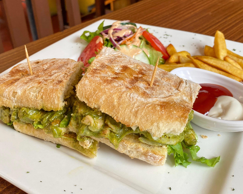 Incluye: Ciabatta, pollo, lechuga, tomate, cebolla, chiltoma, crema dulce, pesto, queso de crema y queso mozarella. Servido con papas fritas y ensalada verde con aderezo mostaza-miel.