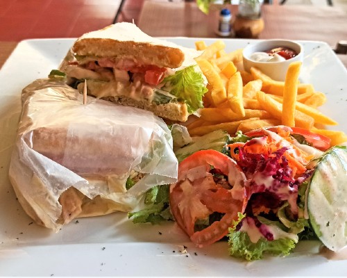 Incluye: Ciabatta, pollo, lechuga, tomate, cebolla, chiltoma, crema dulce, queso de crema y queso mozarella. Servido con papas fritas y ensalada verde con aderezo mostaza-miel.