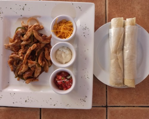 Incluye: Pollo, cebolla, chiltoma, salsa de fajitas, queso cheddar, crema y pico de gallo. Acompañado con tortillas de harina o arroz.