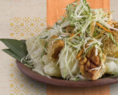 Trozos de chicharrón de cerdo con yuca cocida y ensalada de repollo.