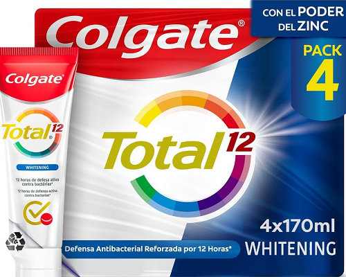 Colgate Total 12. 4 Unidades de 170 mL / 5.7 oz c/u. La fórmula blanqueadora de Colgate Professional ayuda a eliminar con precisión las manchas superficiales. Cepíllese los dientes al menos dos veces al día, preferiblemente después de las principales comidas, y utilice hilo dental al menos una vez al día.