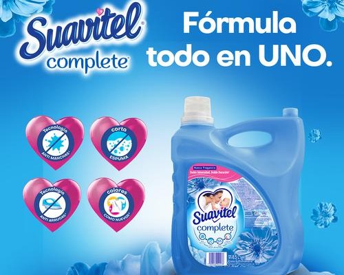 Suavitel Complete maneja una tecnología de protección de tejidos que libera agentes acondicionadores en contacto con el agua, creando una capa protectora, enriqueciendo y reduciendo la fricción durante el proceso de lavado. Te brinda fragancia, protección y suavidad a un precio atractivo; Su increíble fórmula que penetra en las fibras de tus telas elimina los residuos de detergente, reduce las arrugas y protege 3 veces más los colores, además tiene un delicioso aroma que perdura y deja tus prendas suaves como el amor de mamá. Para su uso en lavado a mano: debes agrega 2 tapas de Suavitel Complete al agua del último enjuague. Para su uso en lavadora: debes agregar 2 tapas de Suavitel Complete al agua del último ciclo de enjuague. Para mejores resultados y para evitar manchas temporales no viertas Suavitel Complete directamente en la ropa; dilúyelo previamente en agua.