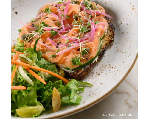 Pan de masa madre, queso crema con eneldo, pepino, láminas de salmón, cebolla encurtida y alcaparras. Acompañado con ensalada o papas salteadas.