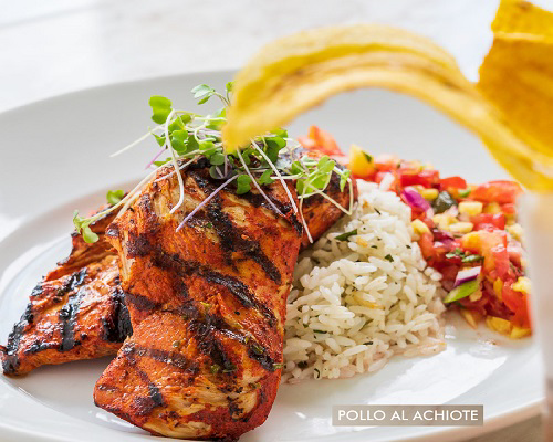 Pollo marinado con achiote al grill, pico de gallo con piña y jalapeño, tajadas de plátano, opción de arroz, vegetales salteados o ensalada verde.