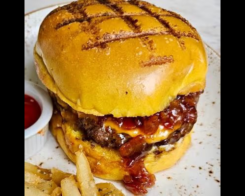 Jalea de tocino hecha en casa, queso derretido, acompañado de papas fritas o ensalada de la casa.