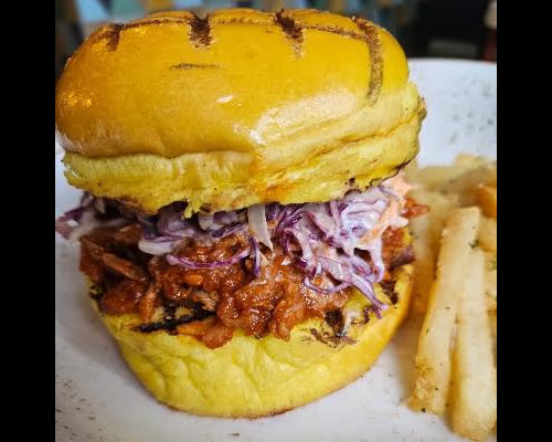 Cerdo desmechado con salsa barbacoa, ensalada de repollo morado y zanahoria, acompañado de papas fritas ó ensalada de la casa.