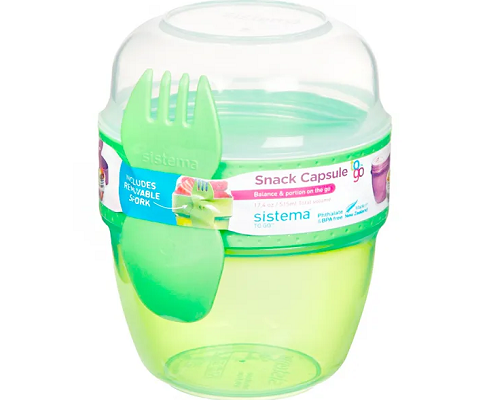 El recipiente Snack Capsule To Go ™ es ideal para llevar tus bocadillos mientras viajas y cuenta con 2 compartimentos para mantener los alimentos separados hasta que estén listos para comer. El práctico tenedor que se engancha en la tapa también elimina la necesidad de llevar cubiertos separados. Este producto es apilable y seguro para usar en el lavavajillas (en la rejilla superior), el microondas (sin la tapa) o en el refrigerador y congelador.