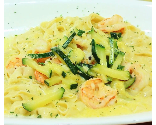 Pasta fresca hecha a mano con caamrones, zucchini and parmesan.