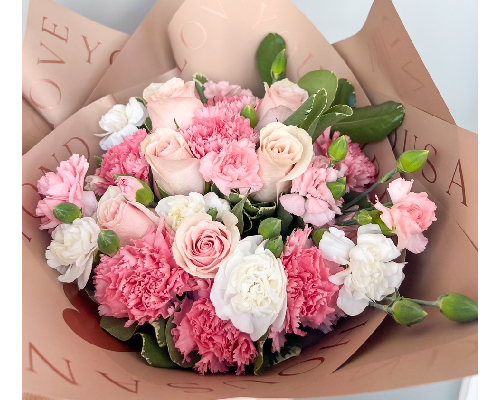 Romántico bouquet de 6 rosas rosadas combinados con claveles blancos y rosados.