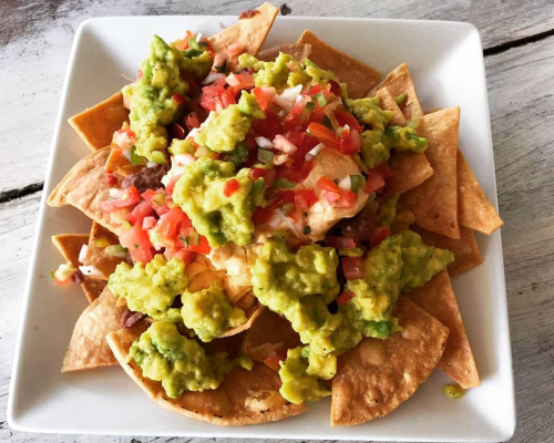 Chips de tortilla de maíz frescos hechos en casa cubiertos con pollo desmenuzado a la barbacoa, salsa cremosa de queso sriracha y Pico de Gallo.