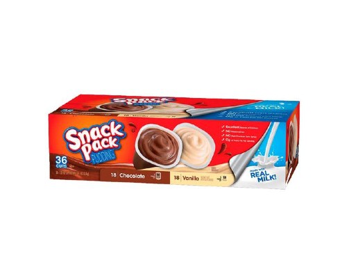 El pudin de chocolate y vainilla de Snack Pack contiene 36 tazas en total, de las cuales 18 son sabor a chocolate y 18 son sabor a vainilla; cada taza de pudin contiene 92 g / 3 oz. Estos deliciosos postres de pudín están hechos de leche real y son una excelente fuente de calcio. Si estas buscando un refrigerio delicioso para agregar a la lonchera de tu hijo, estas pequeñas tazas de pudín te ayudarán.