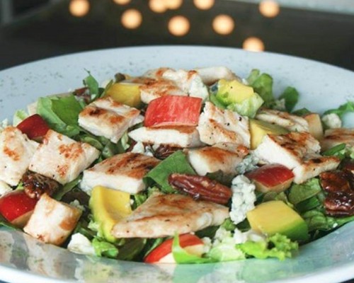 Lechuga mixta con pollo a la plancha, blue cheese, aguacate (en temporada), manzanas, pecanas caramelizadas y con nuestra vinagreta balsámica.