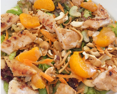 Lechuga mixta con pollo a la plancha, mandarinas, zanahorias, apio, marañones, palitos crujientes acompanados con nuestras vinagreta de maní y naranja.