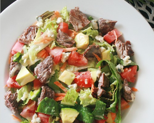 Lechuga mixta, trozos de filete, tomate, aguacate (en temporada), blue cheese con nuestra vinagreta a base de vino tinto y dijon.