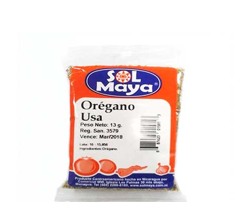 Descripción del producto Producto: Orégano Usa Marca: Sol Maya Envase: Bolsa Plastica Peso Neto: 13gr