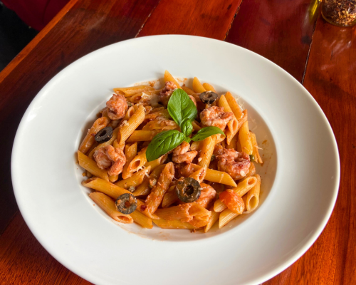Pasta penne, camarones, chile, vino tinto, alcaparras, tomates, parmesano y salsa parmesano.