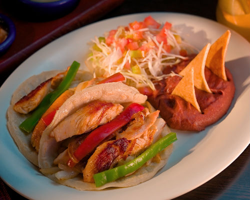 Tortillas con pechuga de pollo en tiras, cebolla y chiltoma, acompañadas con frijolitos molidos y ensalada.